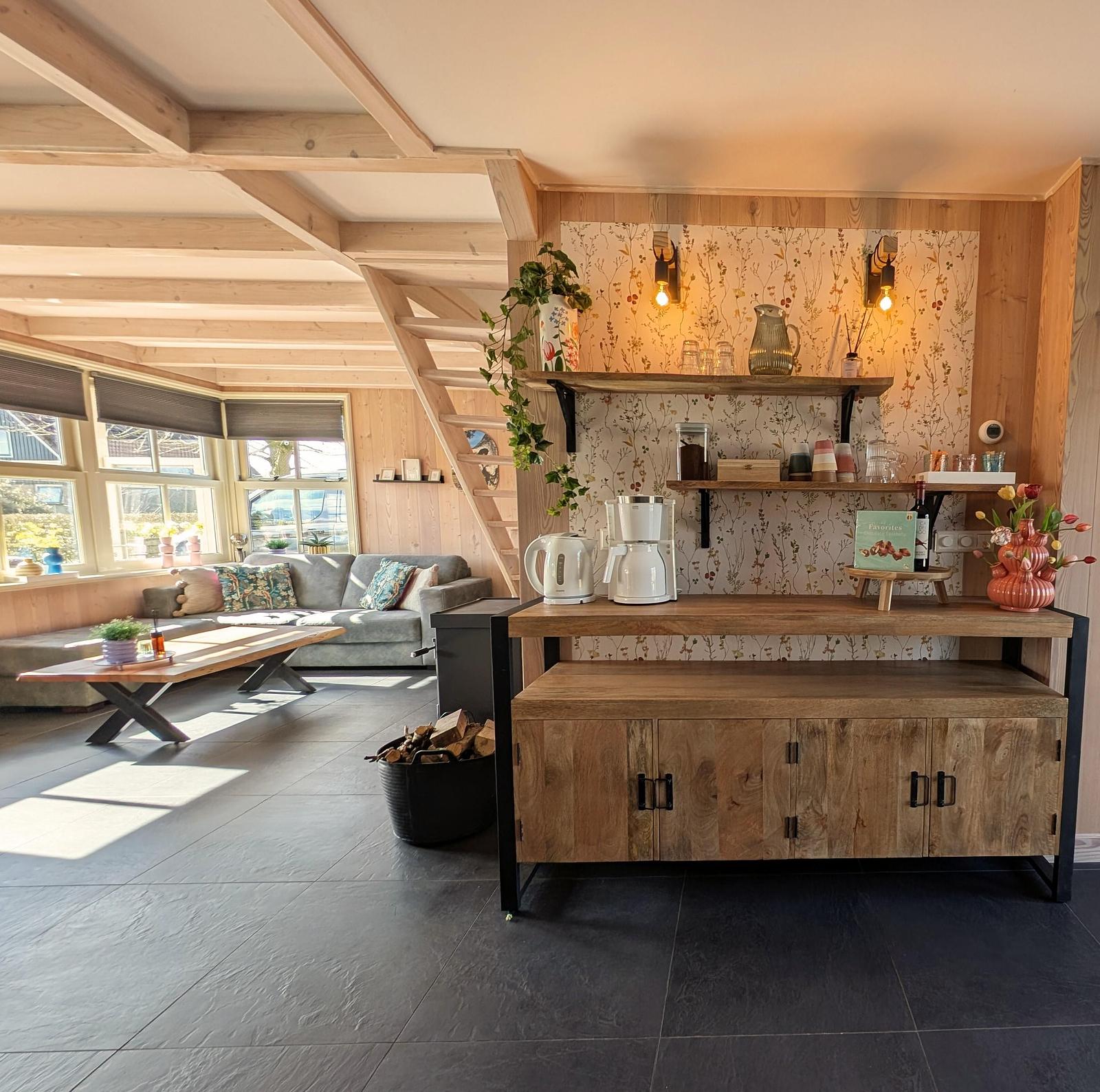 Woonkamer, loungebank, 2 fauteuiltjes, houtkachel, ovale eettafel en genoeg stoelen. Koffiecorner, keuken voorzien van koelkast, vriezer, fornuis, oven, vaatwasser, filterkoffiezetapparaat, waterkoker en kinderstoel